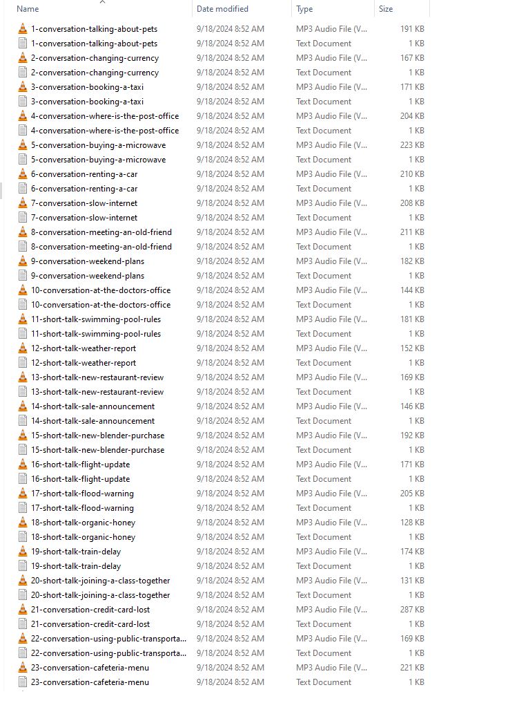 فایلها شامل موضوعات متنوع، جذاب و کاملاً کاربردی هستند از مکالمات روزمره تا مباحث تخصصی در انواع زمینه ها. هر فایل بهگونهای انتخاب شده که دایره واژگان، توانایی تشخیص جزئیات، و درک کلی شما از زبان را به چالش بکشد و تقویت کند.